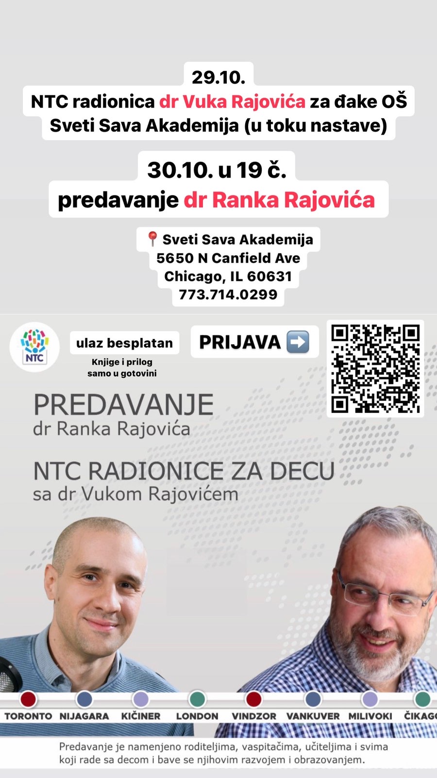 29. октобар, 2024.НТЦ радионица др Вука РајовићаЗа ђаке ОШ Свети Сава Академија (у току наставе) 30. Октобар, 20247:00 увече Предавање др Ранка РајовићаСвети Сава Академија5650 N Canfield AveЧикаго, IL 60631773.714.0299 ПРИЈАВАУлаз бесплатанНТЦ